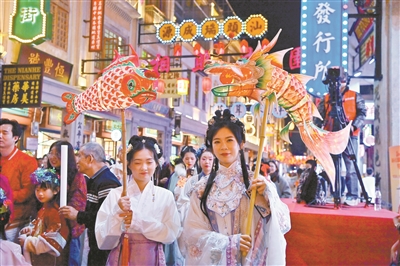 万灯璀璨闹元宵,良辰美景共团圆。元宵节晚上,走进汕头市小公园开埠区,犹如置身于奇幻浪漫的灯火世界。当晚的小公园开埠区人声鼎沸,人们赏花灯、看民俗、品美食,在璀璨灯海中饱尝一场潮侨文化与异国风情相融、传统民俗与现代科技交汇的节日文化盛宴。