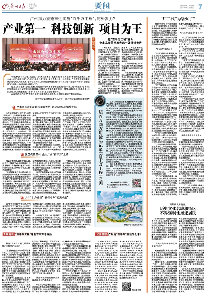 - 产业第一 科技创新 项目为王 今年是“大干十二年、再造新广州”的开局之年,也是实施“百千万工程”的加力提速之年。对全省、全市“头号工程”,广州以“头号力度”推进,着力点是什么?昨日下午,广州市召开高质量发展大会“大抓产业发展,