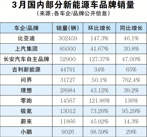 其中,比亚迪3月新能源汽车销量增至30.25万辆,重回30万辆以上,相较于上年同期增幅约46%;吉利3月份售出新车15.08万辆,同比增长约39%;奇瑞3月份同比增长45.3%;广汽埃安3月全球销量32530辆,环比增长95.1%。新势力企业方面,等凭借爆款M7,AITO问界再一次登顶新势力品牌月销量冠军,3月交付31727辆,环比增长50.07%;理想以2.9万辆紧随其后;此外,零跑、蔚来、小鹏等新势力车企3月销量都出现了环比回升。