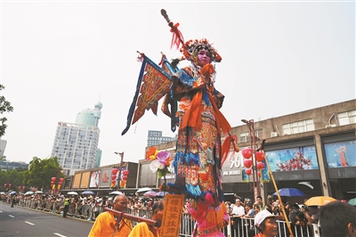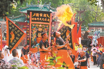 作为佛山祖庙庙会的重头戏,“北帝巡游”在昨日上午10时举行,今年的巡游路线是:祖庙双龙壁前-祖庙正门-祖庙路-人民路-福贤路-建新路-祖庙路-祖庙正门。巡游方阵多达11个,包括北帝仪仗、众仙贺神、中山醉龙、佛山十番、浮石飘色、佛山功夫、七彩伽师、洪拳名扬、岭南醒狮、吉庆满城等近千人参加巡游,其中包括8个国家级非遗项目。这是恢复“北帝诞”以来最完整、最强大的阵容,再现北帝出巡盛况。在祖庙正门外,福贤路与建新路转弯处、百花广场十字路口设置的三个定点表演区,今年首次配备专业讲解员,对各个方阵进行讲解。