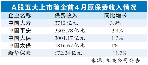 中国人寿、中国平安、中国人保以及中国太保四家险企的前4个月均实现保费收入同比正增长。中国人寿累计保费收入同比增长3.9%,增速位列A股5家上市险企首位;中国平安累计保费收入同比增加2.4%,增速居第二;中国人保和中国太保的累计保费收入分别同比增长1.3%和1%。