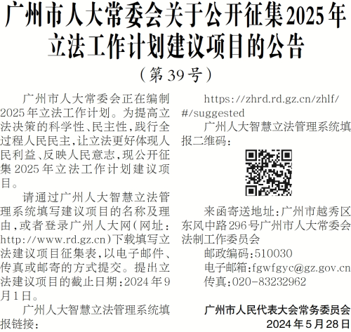 广州市人大常委会关于公开征集2025年立法工作计划建议项目的公告