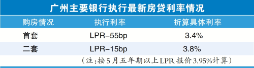 据了解,《通知》发布之前,广州房贷主流银行执行的情况是,首套首付比例不低于三成,利率不低于LPR-10bp(3.85%);二套首付比例不低于四成,利率不低于+30bp(4.25%)。