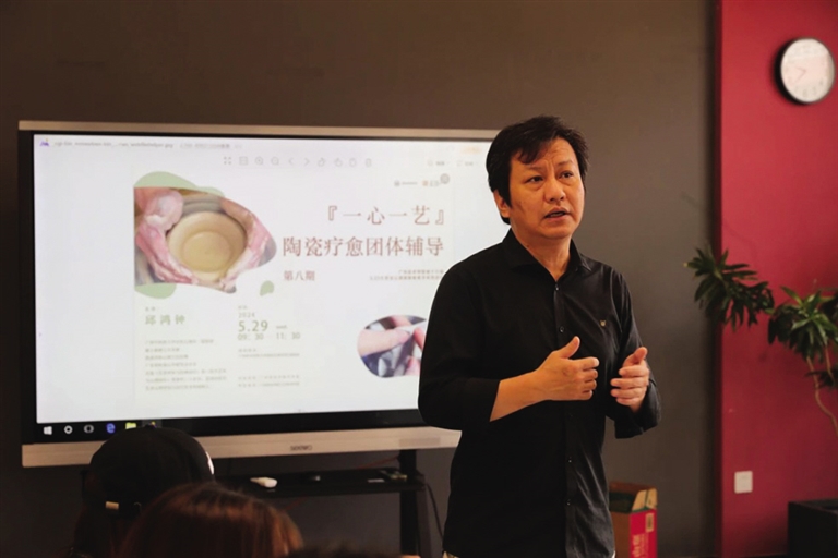 主题讲座以及陶瓷疗愈工作坊均由广东省高校心理健康教育与咨询专业委员会荣誉主任、广州中医药大学二级教授、博导邱鸿钟作为主讲嘉宾开展。邱鸿钟介绍,艺术治疗是一种借助艺术手段和创作的过程促进心理健康的治疗方法。