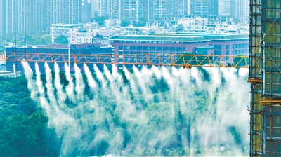 据统计,天河区辖内工地已加装塔吊喷淋装置29台,配备移动雾炮机144个,围挡墙体安装喷雾设施28560米,建成“无废工地”17个。