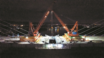 在合龙前期工作筹备期间,项目对合龙口进行长达32小时连续监测。在合龙前一天,项目精确调整合龙口状态,使其达到线形平顺,转角一致,充分满足平顺合龙条件。当天凌晨,在气温达到27℃的最佳合龙温度后,建设团队迅速对合龙段边主梁进行吊装锁定,完成体系转换,最终实现精准对接。