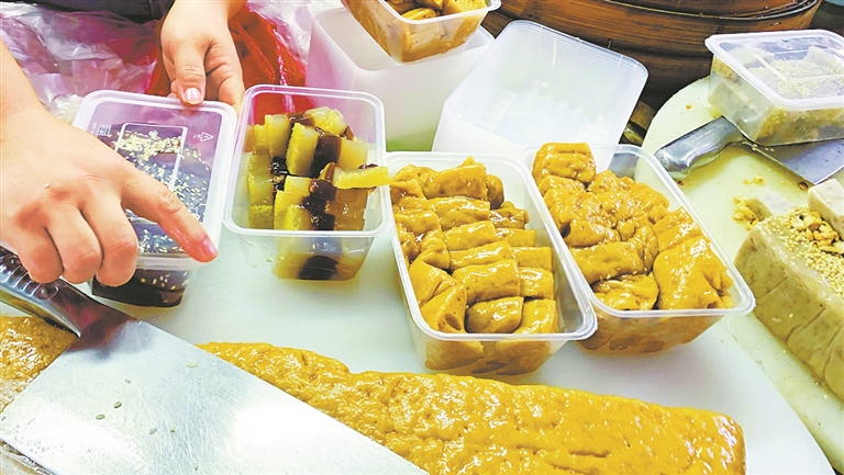 品尝过糕块的外来客无不惊艳其口感:细嫩弹牙,如同嚼肉,绝不黏舌揳齿,一盒糕块不知不觉就吃光。