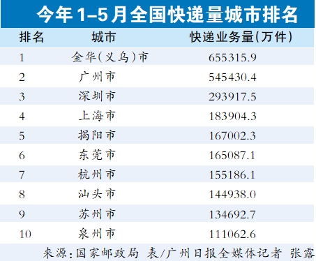 而广州快递量持续排在全国前列。前5个月广州市累计快递业务量和快递业务收入分别是54.54亿件和377.84亿元,均在全国快递业务收入前50位城市中排名第2位。