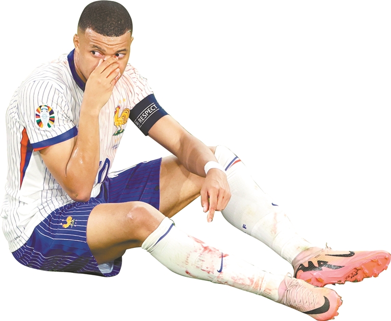 广州日报讯 (全媒体记者 周婉琪) 法国队头号球星姆巴佩在2024欧洲杯首轮小组赛中与对手碰撞导致鼻骨严重变形且出血,被换下场后到医院接受了治疗。