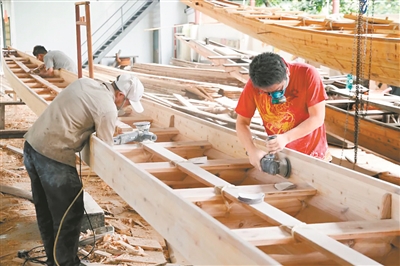 东莞除了赛龙舟,龙舟制作技艺也同样远近闻名。今年春节过后不久,中堂镇的造船厂就陆续接到龙舟订单。3月11日是农历二月初二,“二月二、龙抬头”,中堂镇的龙舟造船厂纷纷举行新龙舟开工大吉仪式。当天,在霍沃标龙舟造船厂里,龙舟师傅们赶订单,起龙骨、打水平、刨光、打磨、上色……霍沃标的儿子霍文忠告诉记者:“今年的订单来自五湖四海,也比往年同期有所增加。”