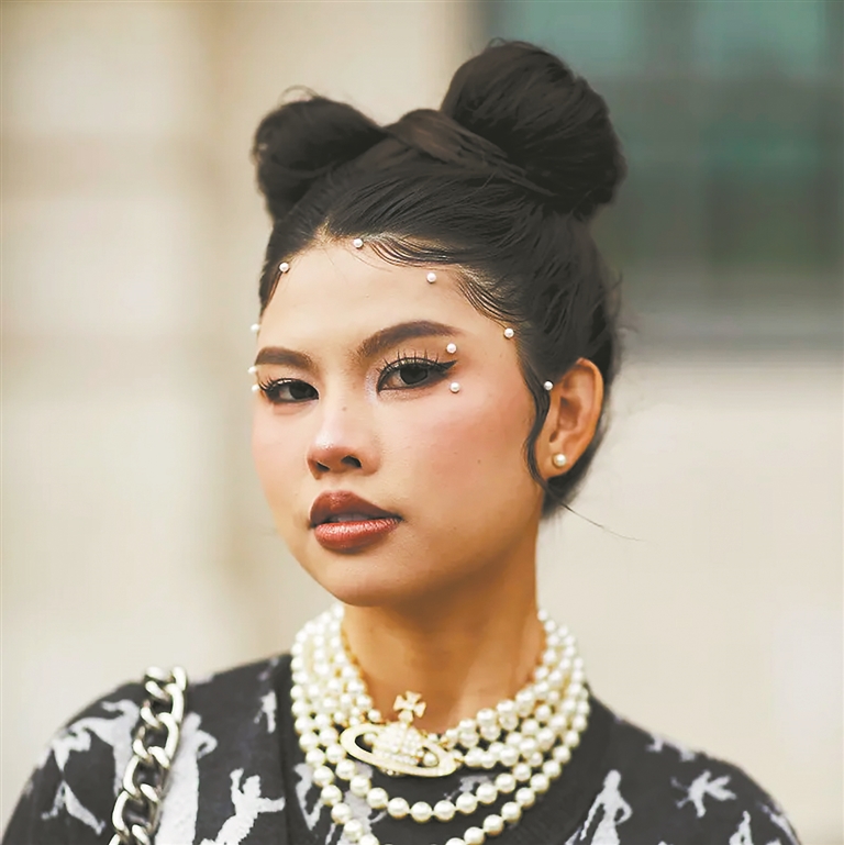 “国际T台上其实早就出现过类似的‘珍珠妆’,比如纪梵希演绎的哥特式珠翠面花,走的就是融合戏剧风;在迪奥的高定秀上,珍珠被应用在模特的眼周或眉毛处,充满仙气。”时装造型指导雷雷告诉记者,中西合璧的妆造在舞台上特别容易出现,但却不太适合日常生活场景。事实上,记者还留意到,在潮人街拍场景中,珍珠“贴贴”的位置甚至被移至发鬓处。“发型也是妆造中的重要部分,将重心从面部移到头部有利于弱化妆容的夸张感,同时保留个性。”时尚博主李米菲分享道。