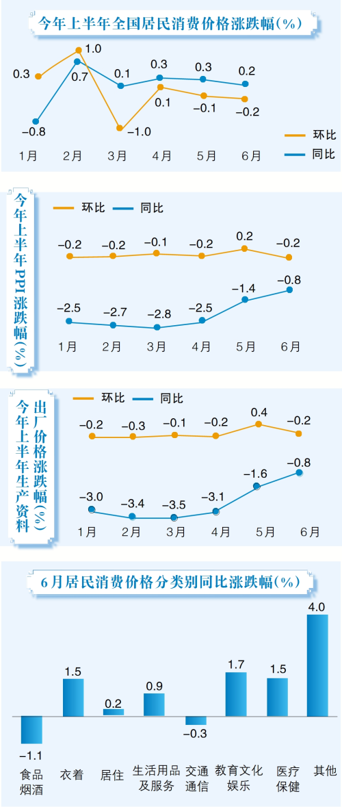 国家统计局城市司首席统计师董莉娟解读称,6月份,消费市场供应总体充足,全国CPI环比季节性下降0.2%,降幅比上月扩大0.1个百分点;同比继续上涨0.2%,涨幅比上月回落0.1个百分点。扣除食品和能源价格的核心CPI同比上涨0.6%,涨幅与上月相同,继续保持温和上涨。