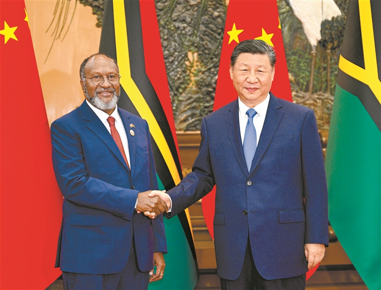 习近平强调,中国坚持大小国家一律平等,坚持义利相兼、以义为先,不寻求大国竞争,不谋求地缘势力范围,不干涉别国内政,不逼迫别国选边站队,始终站在历史正确一边,站在公平正义一边。中国是太平洋岛国地区和平共处、共同发展的推动者和贡献者。中国在联合国的一票永远属于发展中国家。中方从推动构建人类命运共同体的角度看待和重视同太平洋岛国关系,愿继续为岛国经济社会发展和民生改善提供力所能及的帮助,支持岛国加快实现自主、可持续发展目标。