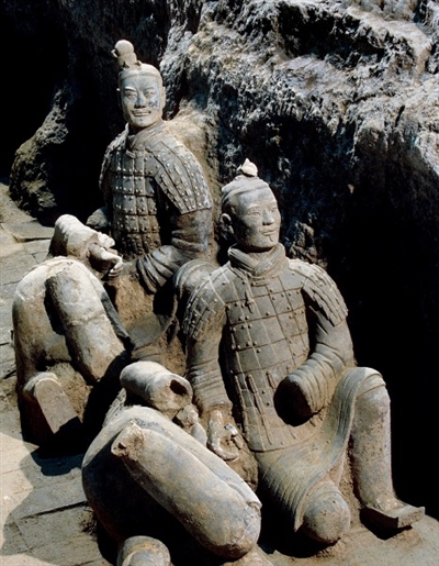 “由于秦末时期,农民起义军攻打到关中以后,他们对陪葬坑进行了焚毁,导致土木结构的坑道垮塌,陶俑受到损坏。”因此造成了现在“残兵”的现状。