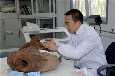 张博士向记者介绍,“经过多年筛选,我们现在采用PU(聚氨酯乳液)和PEG(聚乙二醇)联合保护加固彩绘的技术。”据了解,目前这种保护技术可以保证已有的彩绘残迹完全得以保存而不被破坏。“如果兵马俑身上彩绘有脱落的部分,我们也尽可能利用这项技术把它回贴回去。”对于残留的已脱落彩绘,则通过技术人员的回贴技术进行复原。遵循“修旧如旧”的原则,对于兵马俑残缺的彩绘,不会进行新的彩绘涂绘修补。“我们就保持陶俑的历史原状”,这不仅是对文物的保护,更是对历史的一种尊重。