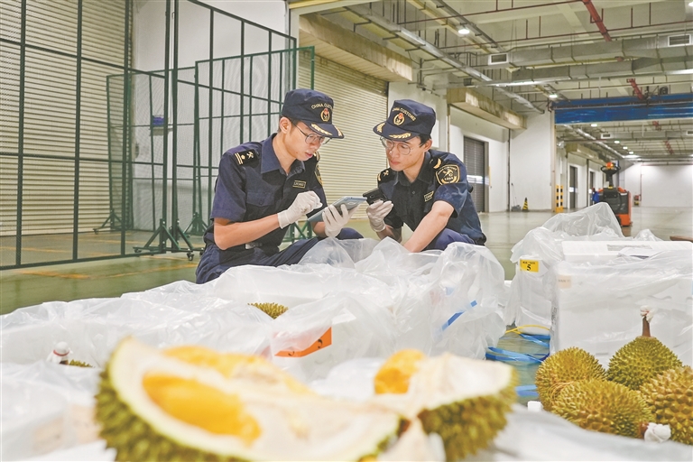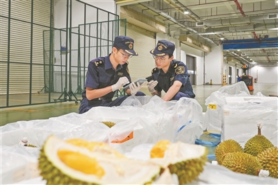 “针对鲜食榴莲不耐储存,通关时长影响着水果的品质和价格的特点,我们主动对接进口商、货代及场站,积极宣讲‘提前申报’‘汇总征税’等便利措施。同时,提前了解企业进口计划,从境外注册果园、包装厂筛选、进境动植物检疫许可办理等角度全方面梳理注意事项,指导企业规范申报。此外,还积极协调场站方压缩货物卸机、拆板、码货时长,支持企业优先检查,确保进境水果‘即到即查、即查即走’,让鲜食榴莲运抵当天就能抢‘鲜’装进老百姓的果篮子里。”深圳宝安国际机场海关综合业务科副科长蔡南楠说。