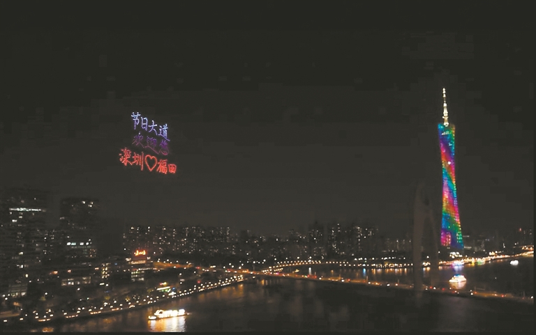 8月26日晚,随着500架无人机从阅江路珠江畔的广报中心腾空而起,璀璨华灯之上,静谧夜空中慢慢浮现出紫蓝和橙红色相加的“节日大道欢迎您 深圳·福田”字样,与广州地标“小蛮腰”惊喜同框,共映珠江水!