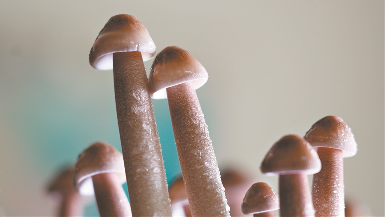 在香勤公司的生产车间内,只见一瓶瓶黄色金针菇和荔枝菌搭乘遍布厂区的全自动运输装置,从育种车间进入菌菇房培养,再从菌菇房进入采摘车间进行成品切割,最后从采摘车间进入包装车间包装下线。车间模拟了荔枝菌的最佳生长条件——恒温恒湿、蓝光照射……在智能设备的“照料”下快速生长,食用菌质量更加稳定,营养价值更高。