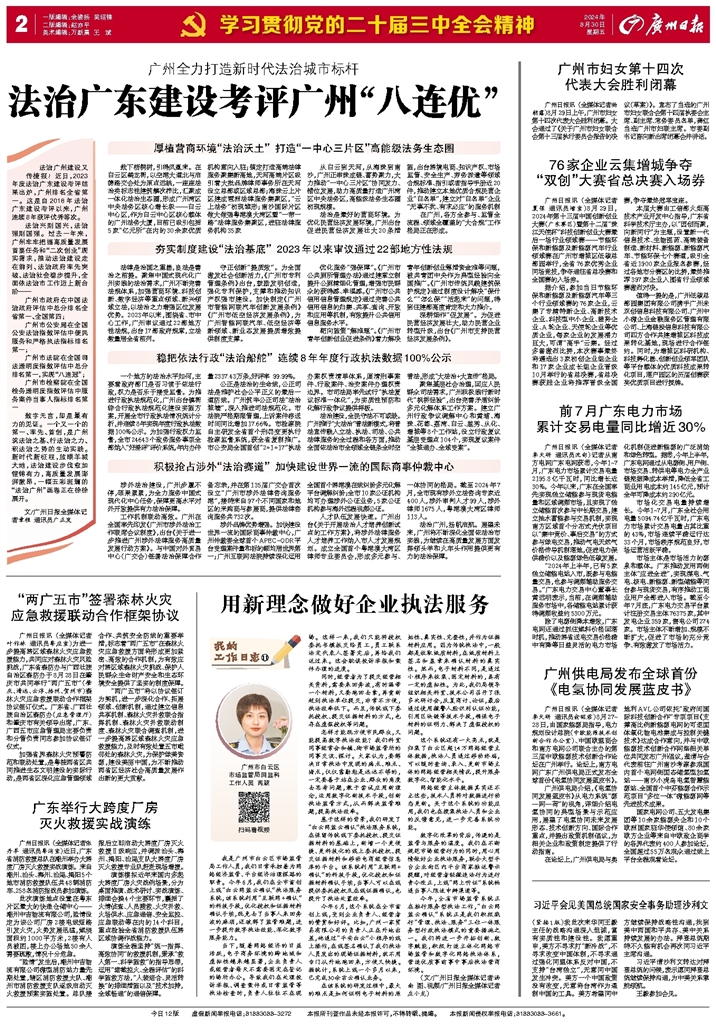 - 法治广东建设考评广州“八连优” 法治广州建设又传捷报!近日,2023年度法治广东建设考评结果出炉,广州排名全省第一。这是自2016年法治广东建设考评以来,广州连续8年获评优秀等次。 法治兴则国兴,法治强则国强。过去一年来