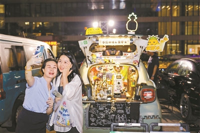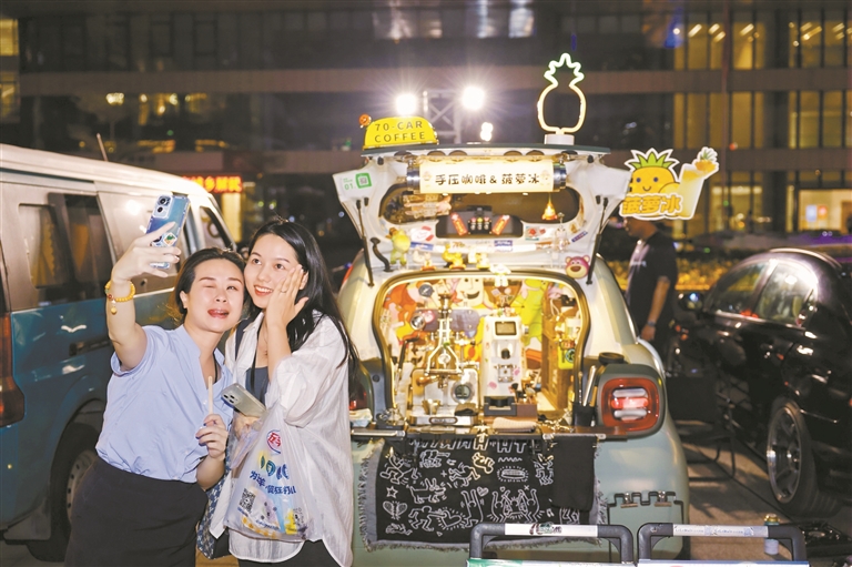 最具网红感的莫过于麦咖啡小黄车和信义车队的车尾厢集市。当晚,游客在麦咖啡消费任意两杯饮品即可DIY咖啡豆手链,戴着咖啡豆手链,手握饮品,吹着晚风,“city感”满满。在车尾厢集市,游客能“淘”来各种手工艺品和玩偶,逛累了的游客则品尝起鸡蛋仔、烤肠、章鱼小丸子等小吃。