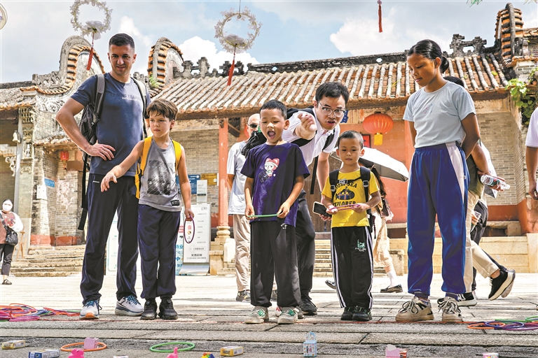 极具岭南乡村特色的镬耳屋、青砖墙、芭蕉树、老祠堂,不仅对外国家庭来说十分新奇,在“广州市书香家庭”江永强眼中,每一次踏进塱头古村,似乎都有新变化。“这是我第二次来这里,发现已经有了民宿、文创商店和特色雪糕店,参观了一下,耳目一新。”他边走边给孩子们讲这条村的历史故事。“百千万工程”打造了古村文旅新名片,许多文创产品将古村故事更好地讲出来,为传播古村魅力注入无穷后劲。
