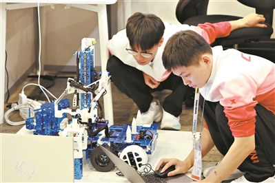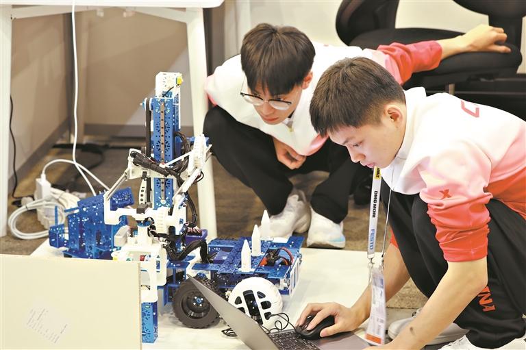在自主移动机器人项目的对决中,蒋家俊与方灿豪成为配合默契的“技能双子星”,为中国代表团夺得一块金牌。“这次赛题出得较晚,导致机器人定型也比较晚,直到赛前一个月才定型,相当于少了一个月与机器人磨合的时间。”方灿豪说,备赛期间两人不断加练、调试,才能在赛场上有更好的表现。