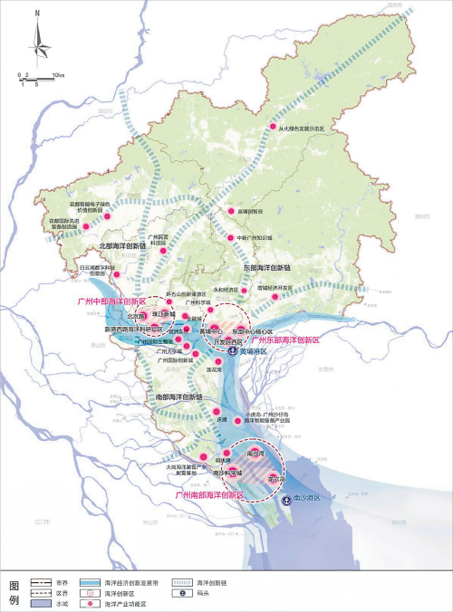 “三区”指以珠江前航道沿岸为核心的广州中部海洋创新区;以环狮子洋黄埔中心、东部中心、莲花湾等为核心的广州东部海洋创新区;以伶仃洋北部的南沙湾、龙穴岛、万顷沙为核心的广州南部海洋创新区。以“三区”为核心,推动广州传统优势产业链向海延伸,推进广州全域的向海发展。打造向海发展的北部、东部、南部海洋创新链,连接创新核心区和周边的产业功能片区,推动海洋经济与城市经济的高度融合。