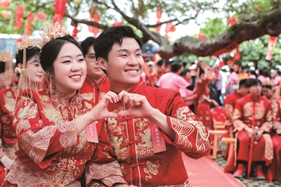 活动现场气氛热烈,锣鼓喧天,彩旗飞舞,舞狮表演热情洋溢,整个会场沉浸在一片喜庆祥和之中。80对身着传统华丽婚服的新人与亲朋好友共同见证了这一重要时刻。在横丽湖畔,“百年连理榕”见证了新人们共饮象征“甜蜜美满”“百年好合”的糖水,将这一古老而温馨的婚俗赋予了新的时代意义。