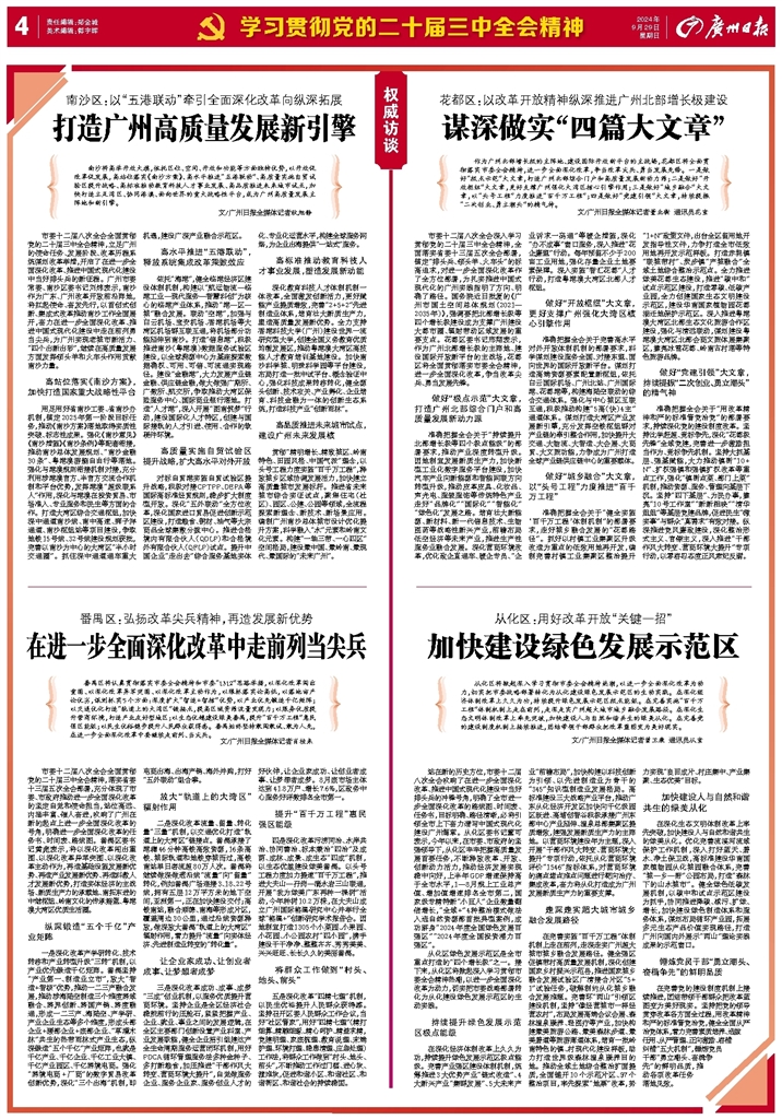 - 谋深做实“四篇大文章” 权威访谈 作为广州北部增长极的主阵地、建设国际开放新平台的主战场,花都区将全面贯彻落实市委全会精神,进一步全面深化改革,争当改革尖兵、勇当发展先锋。一是做好“极点示范”大文章,打造广州北部综合
