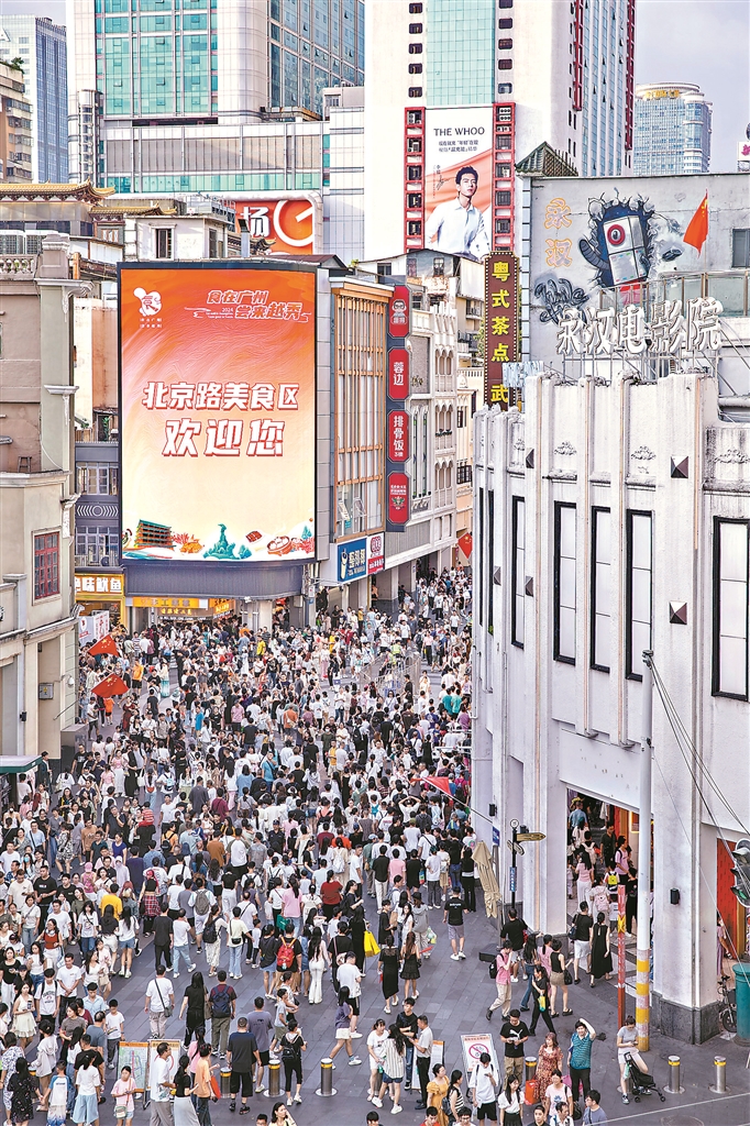 北京路千年古道上,黄金周几乎每天都热闹非凡,演绎着广州千年商都的新画面。广百、广州友谊等商圈名店各具特色的促销营销轮番上演,红火的节日氛围引燃了蓬勃的消费活力。