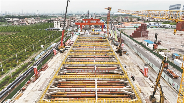 “十一”黄金周,南珠(中)城际项目把握秋季黄金施工期全速推进。位于中山段的香山站、香山站—香二盾构井区间施工现场,800余名施工人员在秋风中挥洒汗水,60台机械不停转动,一派热火朝天的景象。施工单位中铁广州工程局城建公司介绍,香山站全长约1公里,最大宽度49米,最大深度30米,其超长超宽超深的特点国内罕见。