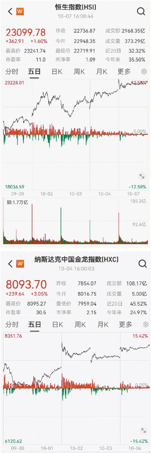 节后A股走势将会如何?从长假期间港股以及中国资产等的走势,也许可见一斑。截至10月7日港股收盘,恒生指数涨1.60%站稳23000点,创2022年2月以来新高;国庆长假A股休市期间,港股恒生指数累计大涨9.33%。同时,中国资产连日暴涨,也让投资者对节后的A股行情充满期待。