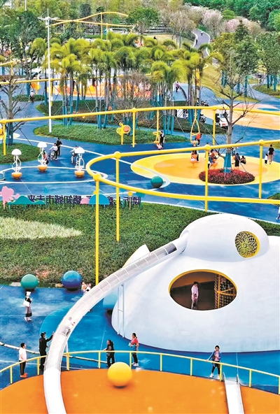 同时,公园中的自然认知乐园也是孩子们喜爱的“宝藏”游玩地之一,这里有阳光草坪区还有器械游戏区,沿途设有公园的植物类型分布情况、鸟类等创意展示牌,向孩子科普生态知识。