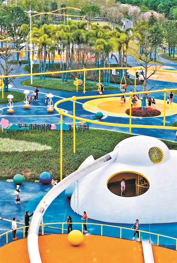 值得一提的是,公园里的儿童友好中子乐园则是一个让孩子在玩耍中学习与科普的主题乐园。该乐园占地2万平方米,在设计建设上充分结合了“国之重器”——中国散裂中子源的工作原理,将其运行步骤转化为5个对应的游玩设备:“水乐园”对应“离子源产生负氢离子”,“滑滑变速场”对应“离子直线器加速变质子”,“转转乐园”对应“质子经环形加速器加速”,“碰碰乐园”对应“质子流打靶体产生中子”,“球球微乐园”对应“中子探测微观世界”,从而为儿童提供了一个童趣好玩的科学学习空间,让儿童在游戏中也可感受“空气中的科学味道”。