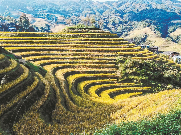 龙脊梯田共分几大观景区。金坑梯田则是目前最为大众知晓的。一路上,梯田层次丰富,线条多以曲线为主,如同天上飘落的金色彩带,充满韵律感。从高处俯瞰,便能看到壮阔的景象,这里的梯田层层叠叠,蜿蜒曲折。金色的稻田给梯田披上了一层黄灿灿的外衣,特别当风吹过,金色的大地变换出流动的曲线,成为浓墨重彩的美景;小寨则是小桥流水人家。