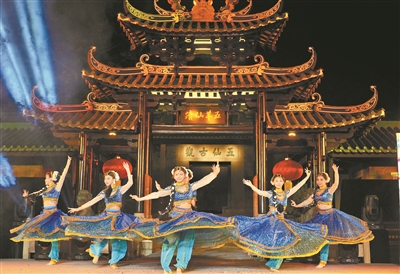 现场以五仙观园林为舞台,以历史为幕布,再现盛唐的繁荣景象。越秀区文化广电旅游体育局副局长何愿飞介绍,“我们创造了从宋代到近代的时空情景,选取了很多海丝的元素,如开场舞蹈《坡山·渡》以生动的肢体语言,让观众领略到古代岭南沿海地区的生活风貌和文化底蕴。”何愿飞说。