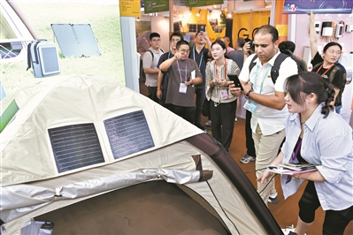 在广交会上,除了家用电器的技术创新,还有很多藏在生活当中的绿色低碳小设计。比如深圳市迪晟能源技术有限公司带来的一款太阳能充气帐篷就不需要支架,拿起一个包说走就走。据介绍,通过用电给帐篷充气,两分钟的时间就能够搭起一个帐篷。
