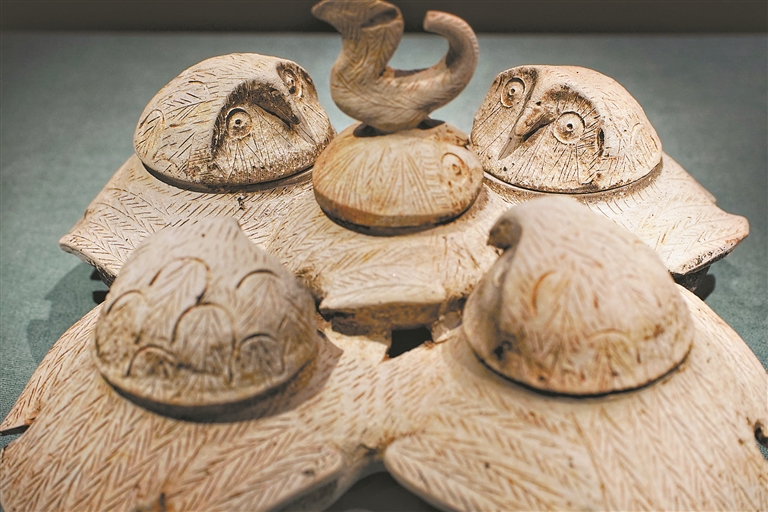 历史时期考古成果精彩纷呈,汉代陶鸮形五联罐、青釉鸡首壶两件一级文物,以及陶鹿座灯、戳印铭文陶罐等精品文物也将在本次展览中亮相,观众可以“透物见人”。有专家推测,陶鸮形五联罐的主要用途是盛放干果,或是一件“零食罐”。