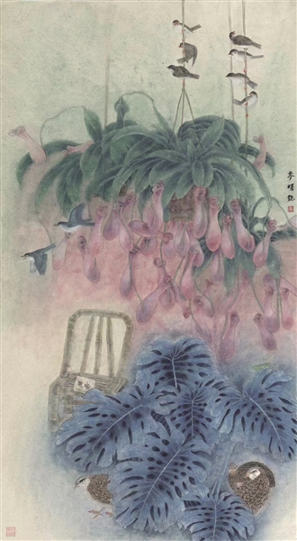 麦曙艳作品《闲趣》风格独特,画面中展现出蓝、绿、淡红相互融合的气氛,一张竹椅点缀在丛林中,用色彩和画面来诠释对休闲生活的向往、对生活的热爱,也体现了她对艺术的执着追求和对生活细节的关注。 (杨永权)