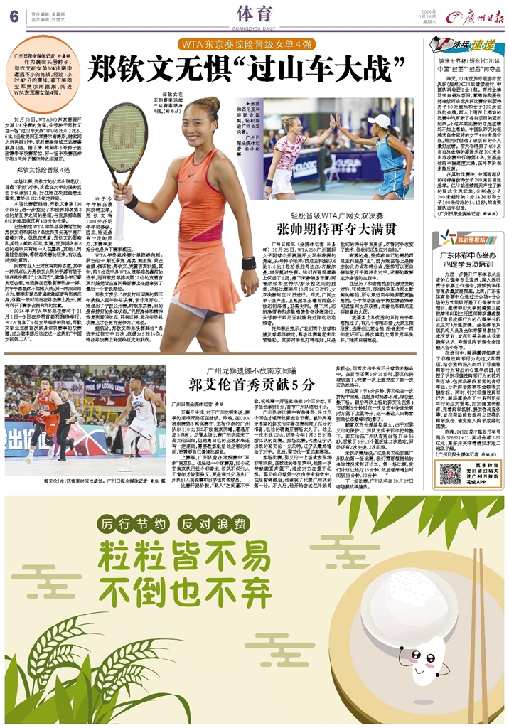 - 郑钦文无惧“过山车大战” 广州日报全媒体记者 孙嘉晖 作为赛会头号种子,郑钦文在女单1/4决赛中遭遇不小的挑战,经过1小时47分的鏖战,拿下美网亚军费尔南德斯,闯进WTA东京赛女单4强。 10月25日,WTA500
