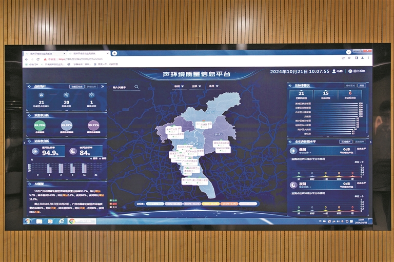 在广州“声环境质量信息平台”上,全市20个声环境质量自动监测站的数据全部联网并实时更新,如果有点位出现超标,就会由绿色变为红色进行提示;系统还会对每条超标的声源进行识别,是属于鸟声、汽车喇叭声、气动噪声还是机械设备作业噪声。