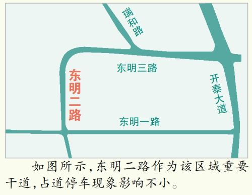陈先生表示,东明二路作为重要干道,长期被违章停放的车辆占道也给附近住户带来了很大不便。尤其一些违停车辆甚至有半截车身“横”在隔壁车道上,一旦有大货车或公交车等“块头”较大的车辆经过该路段,驾驶人都必须小心翼翼,否则很容易发生剐蹭。