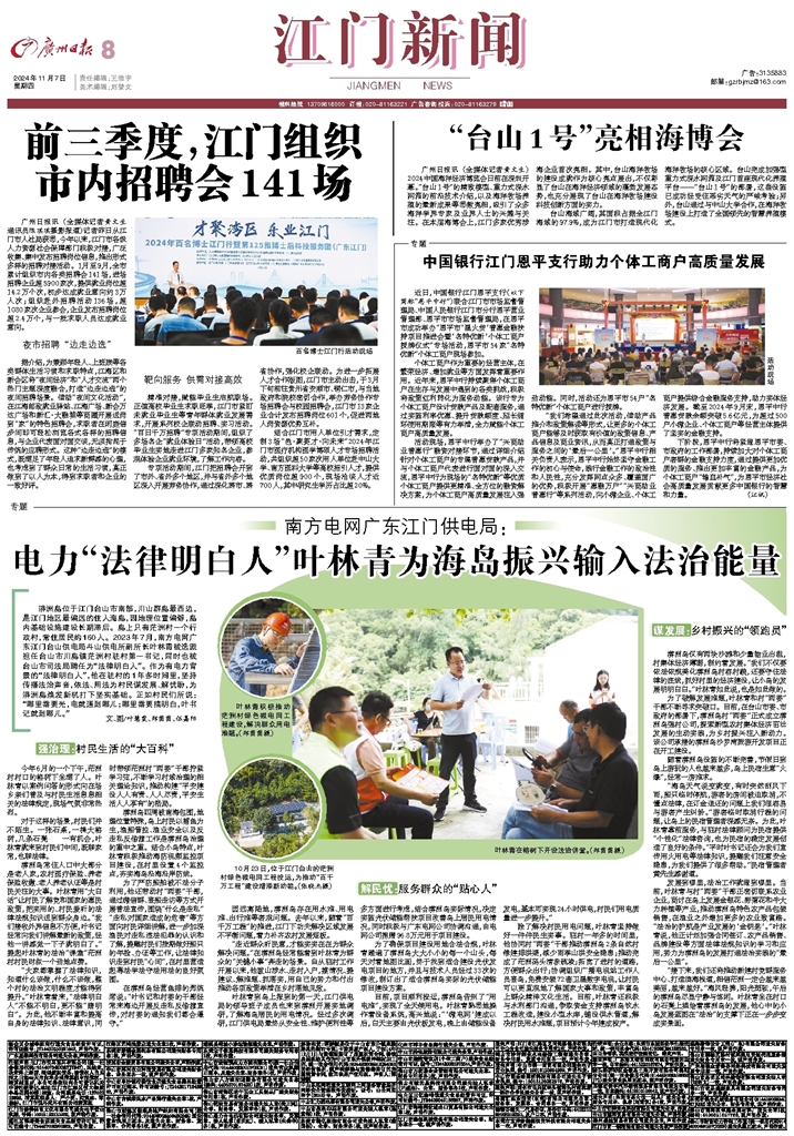 - 电力“法律明白人”叶林青为海岛振兴输入法治能量 漭洲岛位于江门台山市南部,川山群岛最西边,是江门地区最偏远的住人海岛,因地理位置偏僻,岛内基础设施建设长期滞后。岛上只有茫洲村一个行政村,常住居民约160人。2023年7月,南方电网广东江门台山供