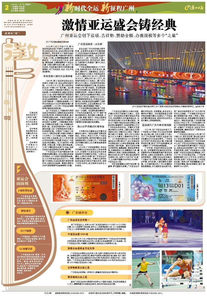 五音之“运”·徵 文/广州日报全媒体记者杨敏 2010年11月12日至27日,第16届亚洲运动会在广州举行,这是继1990年北京亚运会之后,亚运会再次在中国城市举行。来自亚洲45个国家与地