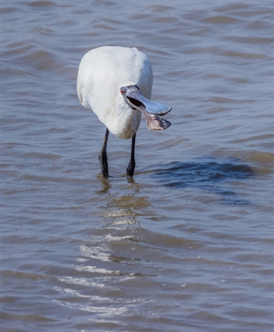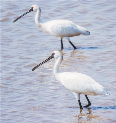 在东莞滨海湾新区磨碟河入海口海滩处咸淡水交汇处,总能看见众多鸟儿在这里悠闲踱步、低头扫食的身影,其中还有两只国家一级保护动物——黑脸琵鹭。