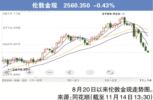 广州日报讯 (全媒体记者 许晓芳)11月14日,现货黄金跌破2560美元/盎司,为9月19日以来首次。近期,随着美元指数周三攀升至7个月来新高,十年期美债收益率上行,金价也出现多日连跌。Wind数据显示,11月以来,现货黄金价格跌幅达到6.78%。