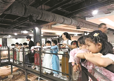 研学活动第二站来到南越王博物院(王宫展区)。同学们随着讲解员的脚步,认真聆听岭南故事,参与研学活动的家长和小读者表示:“以前都是随便看看、逛逛,这次活动我们能真正了解到南越国的历史,学会如何制作古代的瓦片,非常有意义。”