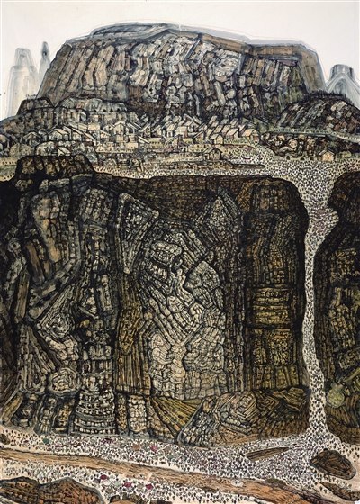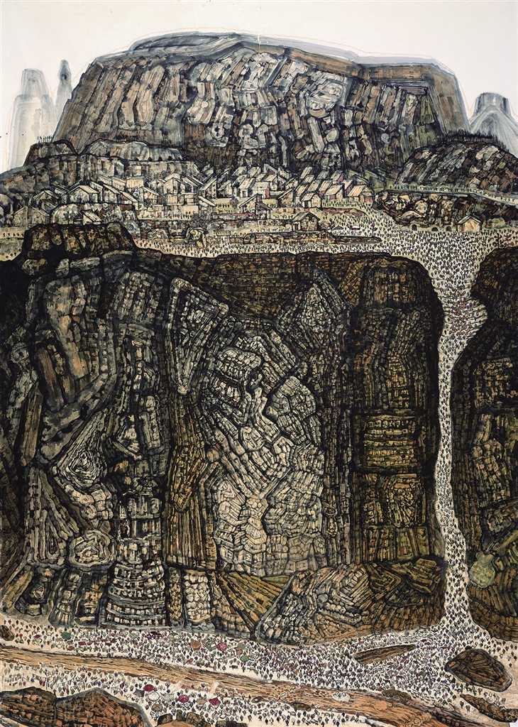 陈新华:我很早就画俯视的构图了,在还没有航拍的时候画俯视的画面完全是想象力的过程。用别人看不到的视角去表现,如同你站到山顶、云端俯瞰大地,从不同的视角去看事物,呈现出来的图像就不一样了。所以,一个优秀的画家要善于从不同的角度、不同的视角去看事物,一个是要靠想象的,一个是要多观察。这正是中国画独特的“以大观小,如观假山”的观察方式。