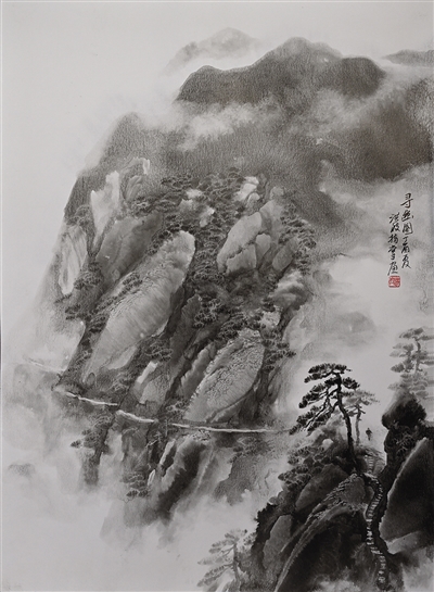 二是缭绕之仙气。肖洪波指掌画的主体视觉效果是云雾缭绕,一派仙气。拙作《题肖洪波指掌画》云:“缈缈云天外,重山若有仙。仙人何处在,雾起漫危巅。”这种云遮雾绕且远离尘气、令人遐想的山,大抵就是国人好驻足云雾之境前冥想神游的文化心理所在,也正是肖氏指掌画的艺术魅力所在。