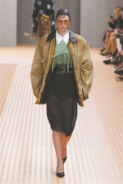 例如今年大牌秀场中,“巴恩风”与户外穿搭呈现高融合度。比如PRADA秀场,在“巴恩风外套”经典板型基础上,设计团队融入多样化设计,如抽绳、口袋等户外元素,而“巴恩风外套”和薄纱裙叠搭呈现出刚柔并济的对比。